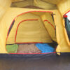 Входы во внутреннюю палатку закрываются москитной сеткой для вентиляции в жаркую погоду. На главном входе москитная сетка также дублируется тканевым пологом, на боковом и торцевом входах во внутреннюю палатку дверь выполнена из москитной сетки. Чтобы в критический момент не перепутать молниивыхода и москитной сетки, они имеют различный цвет: красная молния открывает выход, а черная — москитнуюсетку. Молнии крупные,8-го размера. На замках молнии удобные петельки оранжевого и черного цвета. Открытые пологи входа можно свернуть и зафиксировать баклей. Приполностью закрытой москитной сетке внутренняя палатка надежно защищает от пауков, комаров, змей. Старайтесь держать внутреннюю палатку всегда закрытой.